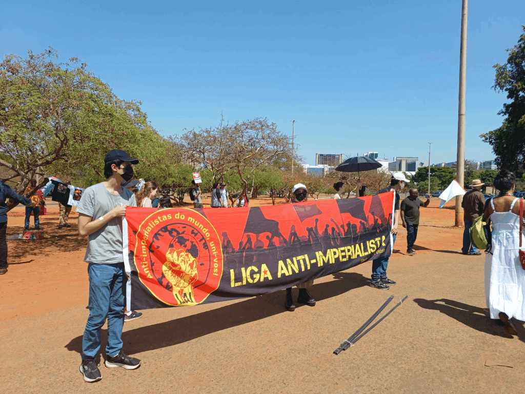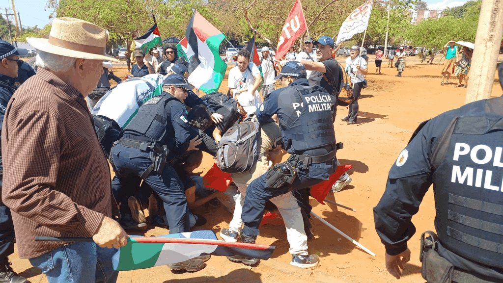 A manifestação se concentrou em frente a embaixada ianque e a combatividade dos ativistas, que exigiram o rompimento imediato de relações diplomáticas do Brasil com a entidade genocida, levantou imediatamente a fúria da Polícia Militar do Distrito Federal (PMDF), que respondeu com repressão brutal contra os manifestantes, com gás, spray e agressões físicas.