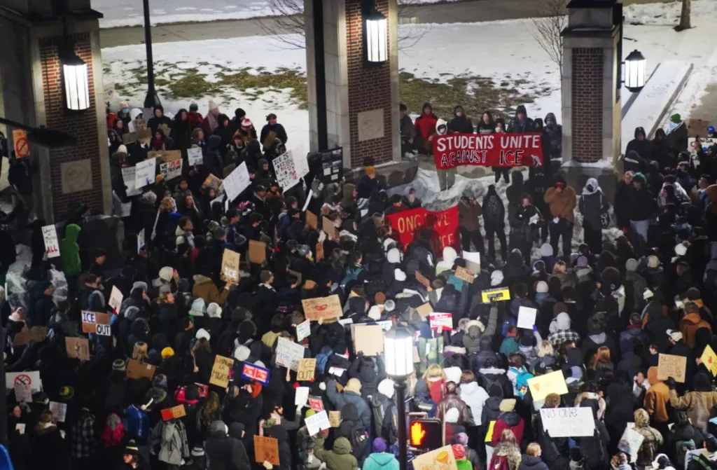 Em West Lafayette, Indiana, mais de 600 estudantes, trabalhadores e professores participaram de um protesto contra o ICE em 5 de fevereiro na Universidade Purdue. O protesto foi organizado pela Frente Estudantil Revolucionária de West Lafayette. Os ativistas da RSF fizeram discursos denunciando o eleitoralismo e as máfias republicana e democrata, ligando o terror do ICE ao imperialismo dos EUA e apelando a uma luta revolucionária contra a classe dominante, e hastearam faixas com os dizeres «Estudantes Unidos Contra o ICE» e «Viva a Resistência». Organizações reformistas e revisionistas boicotaram o protesto ou tentaram cooptar a manifestação, mas os seus discursos e esforços de agitação foram silenciados pelos ativistas da RSF.