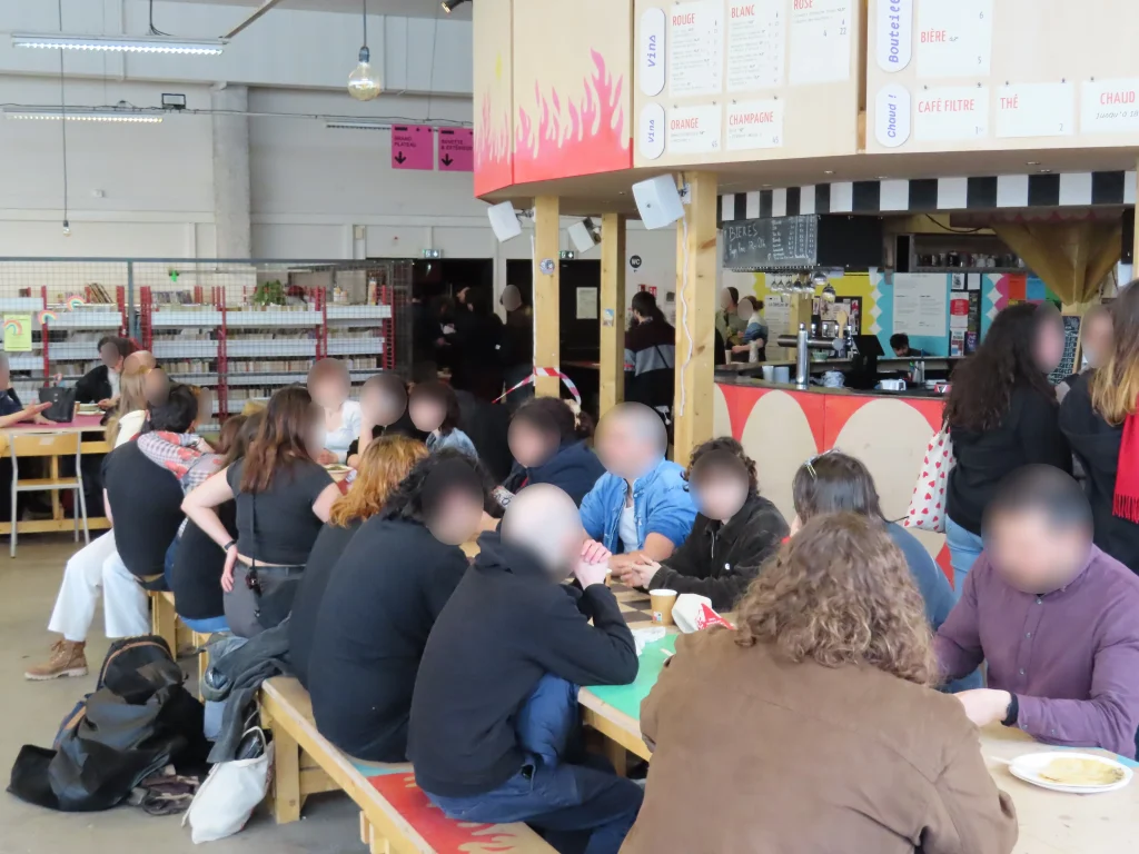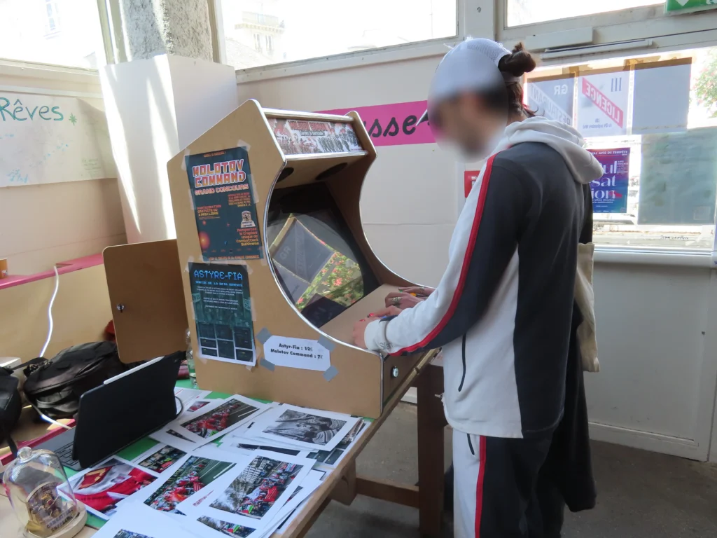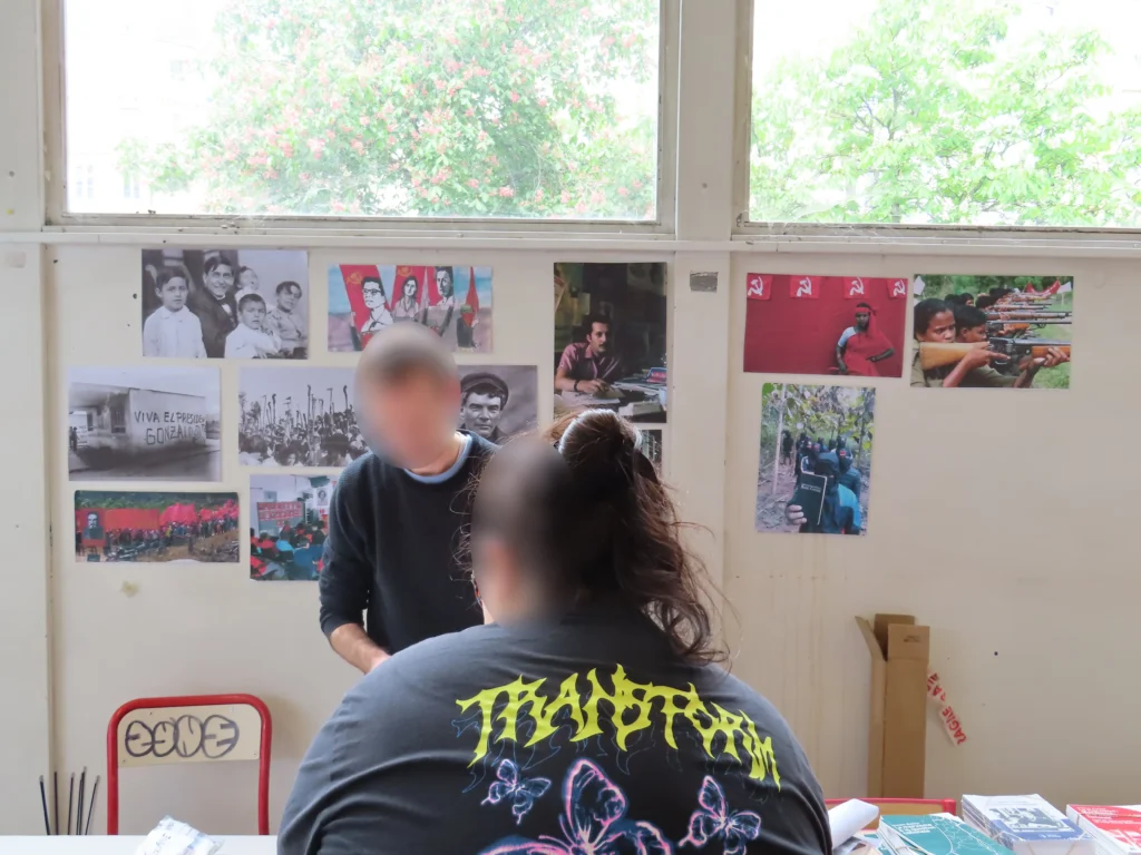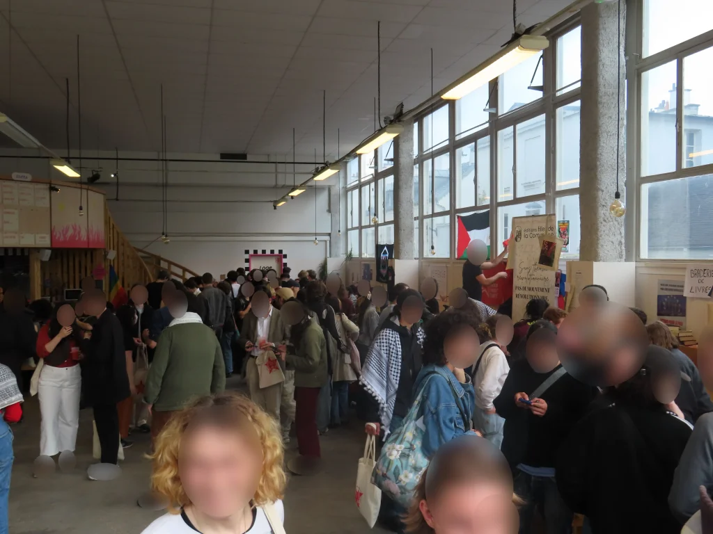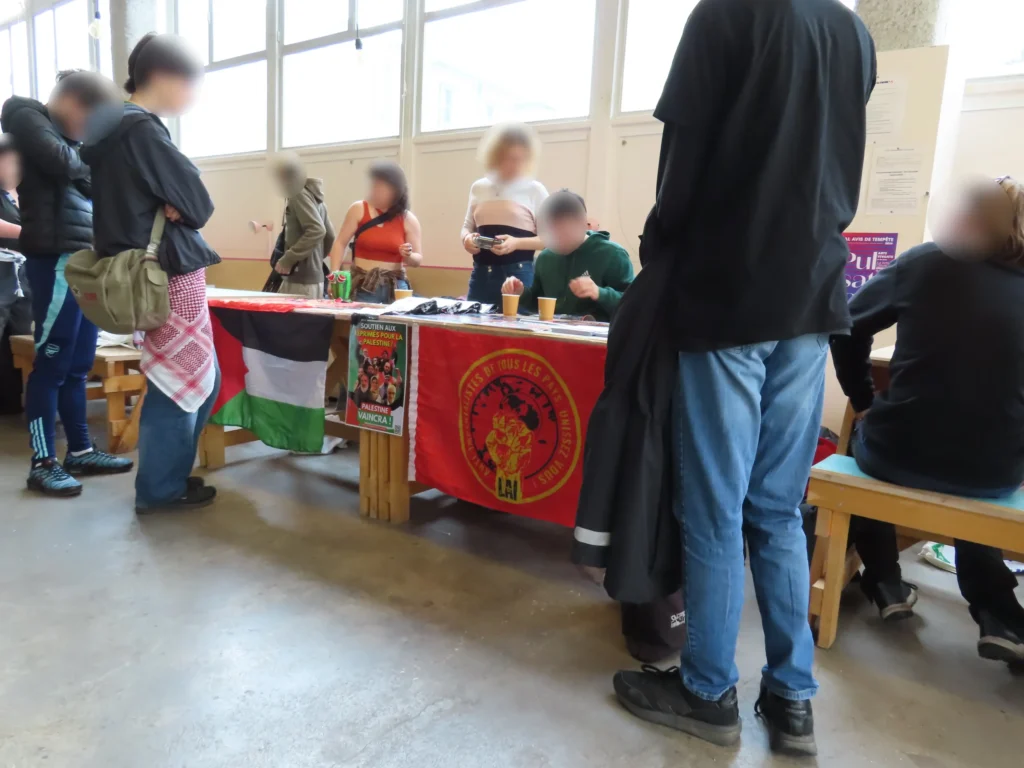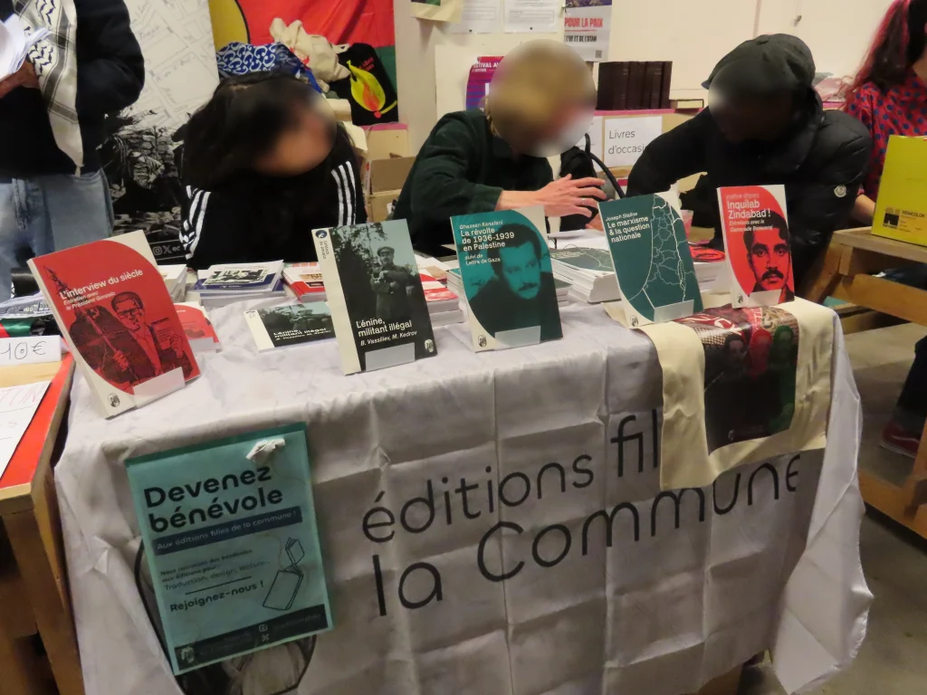 Também foi aberto ao público um salão com mesas de várias organizações, incluindo a Federação Sindical Estudantil (FSE), o Comitê para a Reconstituição do Partido Comunista da Córsega, a editora “Filhos da Comuna”, La Cause du Peuple [imprensa proletária, anti-imperialista e revolucionária] e muitas outras, com todo tipo de material político, incluindo literatura revolucionária, cartazes, adesivos e roupas. Havia até mesmo um jogo de fliperama feito especificamente para o evento.