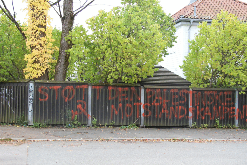 A palavra de ordem «APOIAR A LUTA DA RESISTÊNCIA PALESTINIANA!» terá sido pintada na sexta-feira à noite nas imediações do local da manifestação.