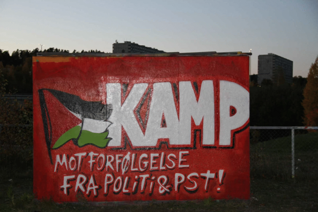 Activistas revolucionários pintaram um mural com o slogan «LUTA CONTRA A PERSECUÇÃO DA POLÍCIA E DO PST!» no bairro operário de Grorud, em Oslo.